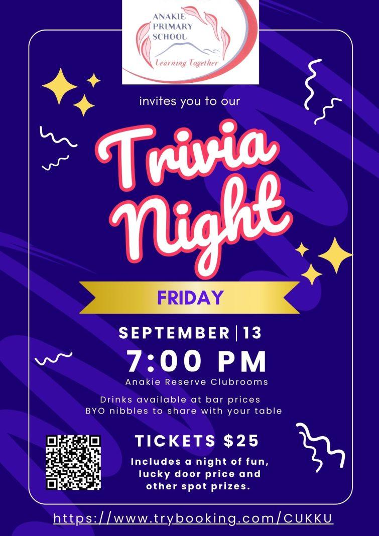 Get excited - Anakie PS is hosting a Trivia Night on Friday 13th September at the Anakie Football/Netball Club. We invite past, present and future members of the Anakie PS community, as well as family and friends. Get your tables organised, you can either purchase individual tickets or whole tables but get in quick so you don't miss out! Thank you so much to the Anakie FNC for supporting our event. This is strictly an 18+ event, drinks available at bar prices, bring along snacks/nibbles to share with your table. It's going to be a great night, professionally hosted.
