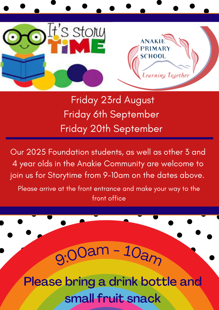 We had a great first session of Storytime for the year last Friday. We look forward to welcoming our 2025 Foundation students, and any other 3 and 4 year old children from the Anakie community on the dates listed in the flyer below: